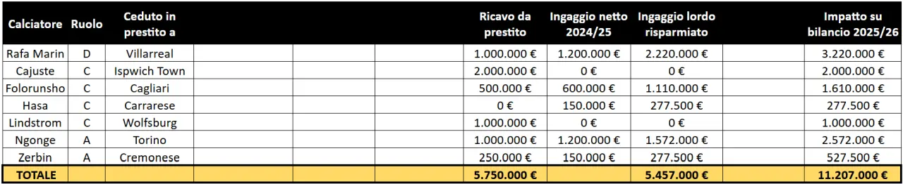 Tra entrate e uscite, dunque, l’impatto sul bilancio 2025/26 del calciomercato finora concluso dovrebbe tradursi secondo le stime in un impatto positivo per 21,7 milioni di euro circa.