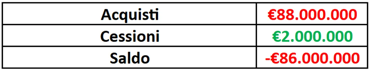 Considerando invece il solo saldo tra entrate e uscite per quanto riguarda i cartellini (solo le operazioni a titolo definitivo), la sessione di mercato per la Fiorentina ha fatto registrare un saldo negativo di ben 86 milioni di euro.