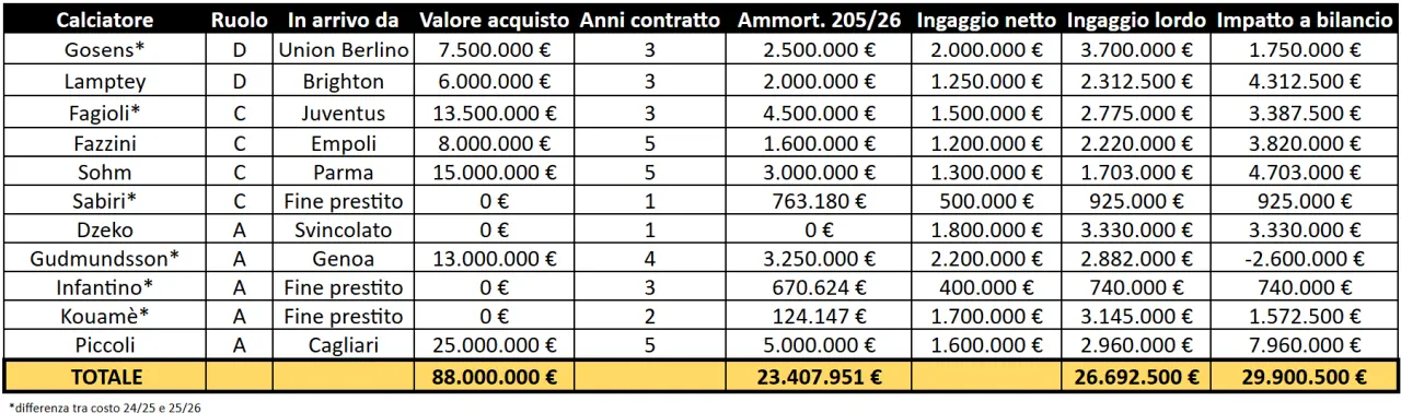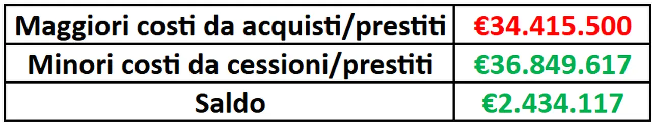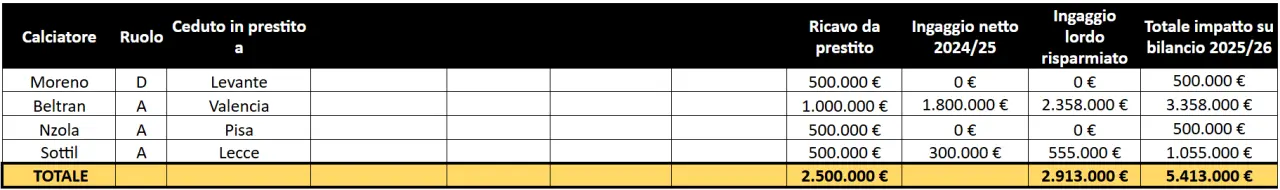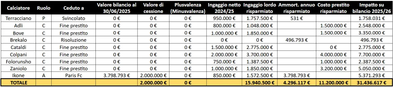 Le operazioni in uscita dovrebbero avere, secondo le stime di Calcio e Finanza, un impatto positivo per circa 36,85 milioni di euro su bilancio 2025/26.