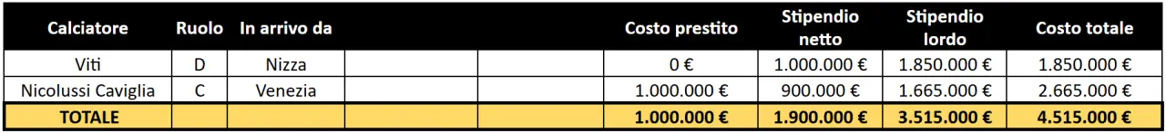 Secondo le stime di Calcio e Finanza i nuovi innesti, tra ammortamenti dei calciatori acquistati a titolo definitivo e stipendi lordi, dovrebbero tradursi in maggiori costi per circa 34,4 milioni di euro.