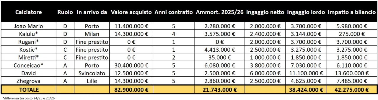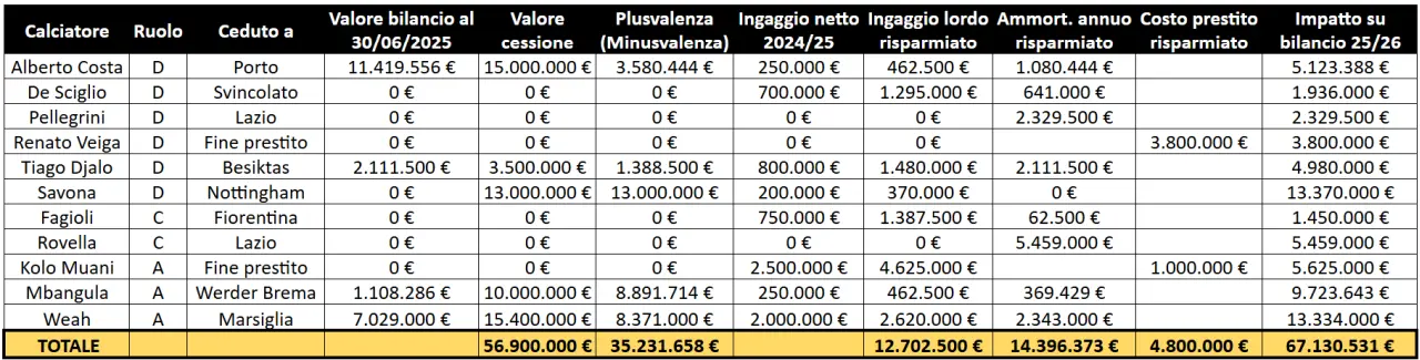 Nella tabella sono stati riportati anche due calciatori che non sono più nella rosa della Juventus da tempo: Pellegrini e Rovella. Entrambi alla Lazio, il loro riscatto è avvenuto alla fine della passata stagione dopo un prestito biennale e dal nuovo esercizio la Juventus non avrà più tra i costi il loro ammortamento.