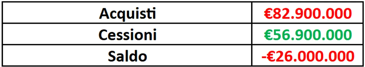Considerando invece il solo saldo tra entrate e uscite per quanto riguarda i cartellini (solo le operazioni a titolo definitivo), la sessione di mercato per la Juventus si è conclusa con un saldo negativo di poco più di 26 milioni di euro.