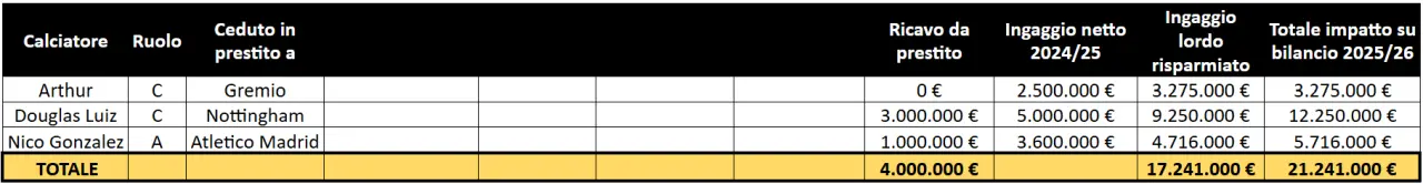 Le operazioni in uscita dovrebbero avere, secondo le stime di Calcio e Finanza, un impatto positivo per circa 88,37 milioni di euro per il bilancio 2025/26. A questa cifra ci si arriva sommando le plusvalenze/minusvalenze realizzate, il risparmio di ammortamento (nel caso dei giocatori ceduti a titolo definitivo) e il risparmio sull’ingaggio lordo per i giocatori usciti dalla rosa bianconera rispetto alla stagione 2024/25.