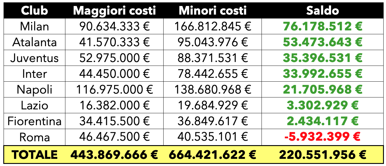 Prima di addentrarci nei numeri e nelle specificità di ogni club, va ricordato che abbiamo provato a simulare l’effetto degli affari estivi e invernali sul conto economico delle società: