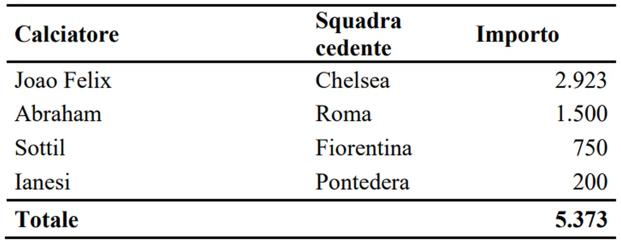 «Le operazioni perfezionate nel corso dei mesi di luglio e agosto della campagna trasferimenti 2024/2025 hanno comportato complessivamente un incremento del capitale investito di 82 milioni di Euro, derivante da investimenti per 82,1 milioni di Euro, cessioni per 0,1 milioni di Euro (valore netto contabile dei diritti ceduti). Si segnala altresì la realizzazione di plusvalenze per 2,5 milioni di Euro», si legge nel documento.