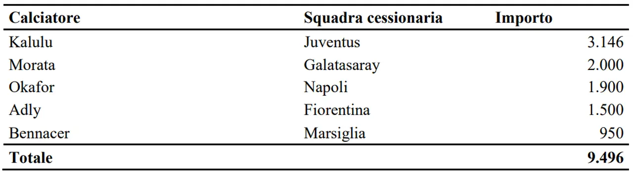 Infine, «nel corso del mese di giugno 2025 si sono perfezionate le cessioni a titolo definitivo dei diritti alle prestazioni sportive del calciatore Tijjani Reijnders al Manchester City, del calciatore Pierre Kalulu Kyatengwa alla FC Juventus, del calciatore Marco Pellegrino al Boca Juniors, che hanno generato plusvalenze per 56 milioni di Euro», conclude il Milan.