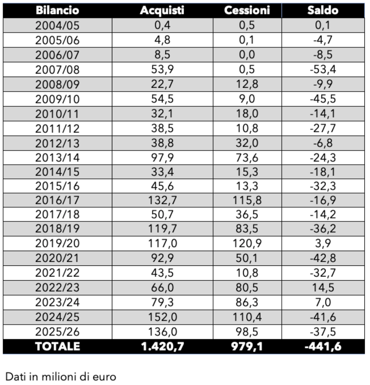 Inoltre, il Napoli pur non entrando nel dettaglio delle varie cifre dei singoli calciatori, ha messo nero su bianco anche i numeri della sessione estiva di calciomercato per la stagione 2025/26. Nel bilancio che Calcio e Finanza ha consultato infatti si legge: «Si segnala che, successivamente alla data di chiusura del presente bilancio, la Società ha concluso cessioni a titolo definitivo di diritti pluriennali alle prestazioni di calciatori, realizzando plusvalenze per complessivi Euro 98,5 mln. e cessioni a titolo temporaneo per complessivi Euro 4,9 mln. Parallelamente, ha concluso acquisizioni di diritti alle prestazioni di calciatori a titolo definitivo per Euro 136,0 mln e acquisizioni a titolo temporaneo per Euro 8,8 mln».