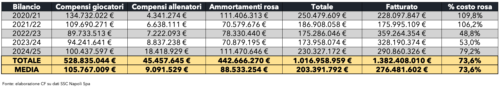 Investimenti importanti, quindi, che, complice il sistema di ammortamenti a cifre decrescenti utilizzato dal Napoli (che comporta i maggiori costi nei primi anni di contratto dei giocatori), ha visto impennarsi il costo rosa nel 2024/25: in particolare infatti, considerando anche i compensi contrattuali per gli allenatori, complessivamente il club ha avuto costi per la squadra pari a 230,3 milioni di euro, ovverosia il 79% del fatturato. Cifra salita in maniera rilevante considerando il 53% del 2023/24 e il 49% del 2022/23, mentre negli anni precedenti, quelli cioè più colpiti dal Covid, aveva addirittura superato il 100% del fatturato nel 2020/21 e nel 2021/22.