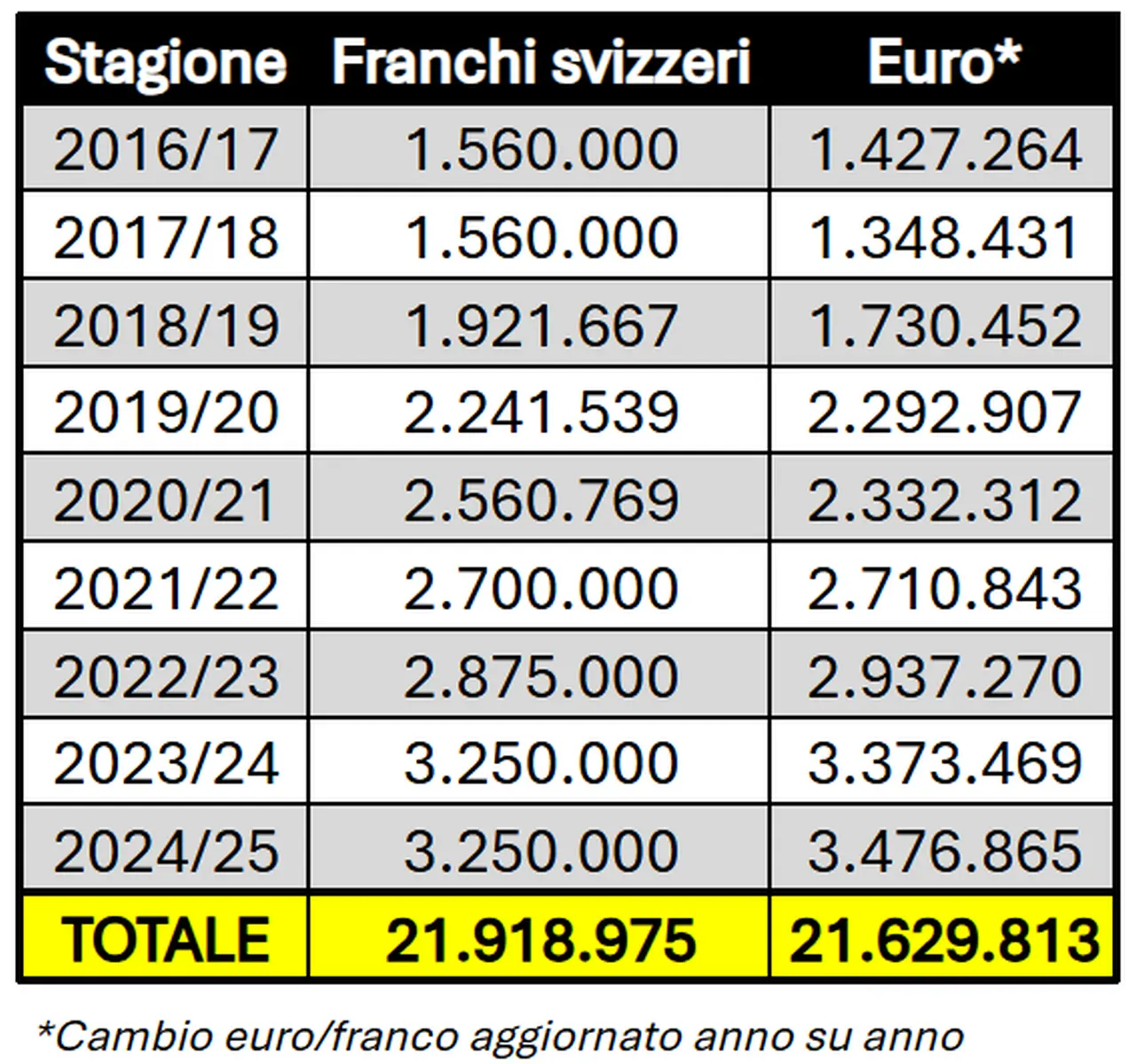 Sulla base di questo ultimo dato, è possibile analizzare lo stipendio di Ceferin nel corso degli anni, dato che la cifra viene messa nero su bianco nei documenti della UEFA a partire dalla stagione 2017/18. Una stagione in cui ha guadagnato 1,56 milioni di franchi svizzeri (circa 1,35 milioni di euro al cambio al 30 giugno 2018).