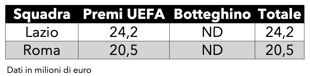 Molto meno importanti sono stati invece i ricavi assicurati dalla Europa League a Lazio e Roma che hanno partecipato alla seconda manifestazione continentale la stagione scorsa: