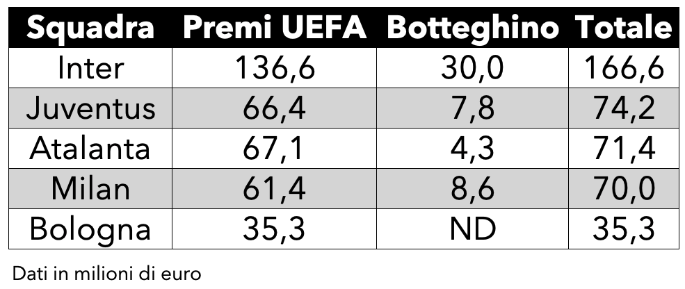 Notevoli sono stati anche i guadagni di Atalanta, Juventus e Milan che pure sono state eliminate ai play off: rispettivamente 71,4 milioni, 74,4 milioni e 70 milioni. E non è stato nemmeno male l’incasso del Bologna, che venne eliminato nel girone unico: 35,3 milioni di premi UEFA a cui andrebbero sommati gli introiti da stadio che però non sono disponibili.