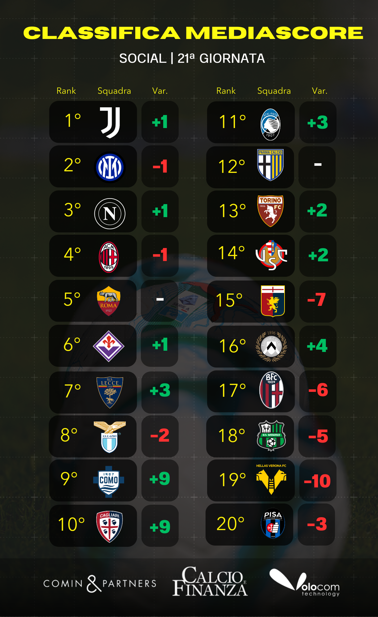MediaScore 21^ giornata – Come cambia la classifica sui social