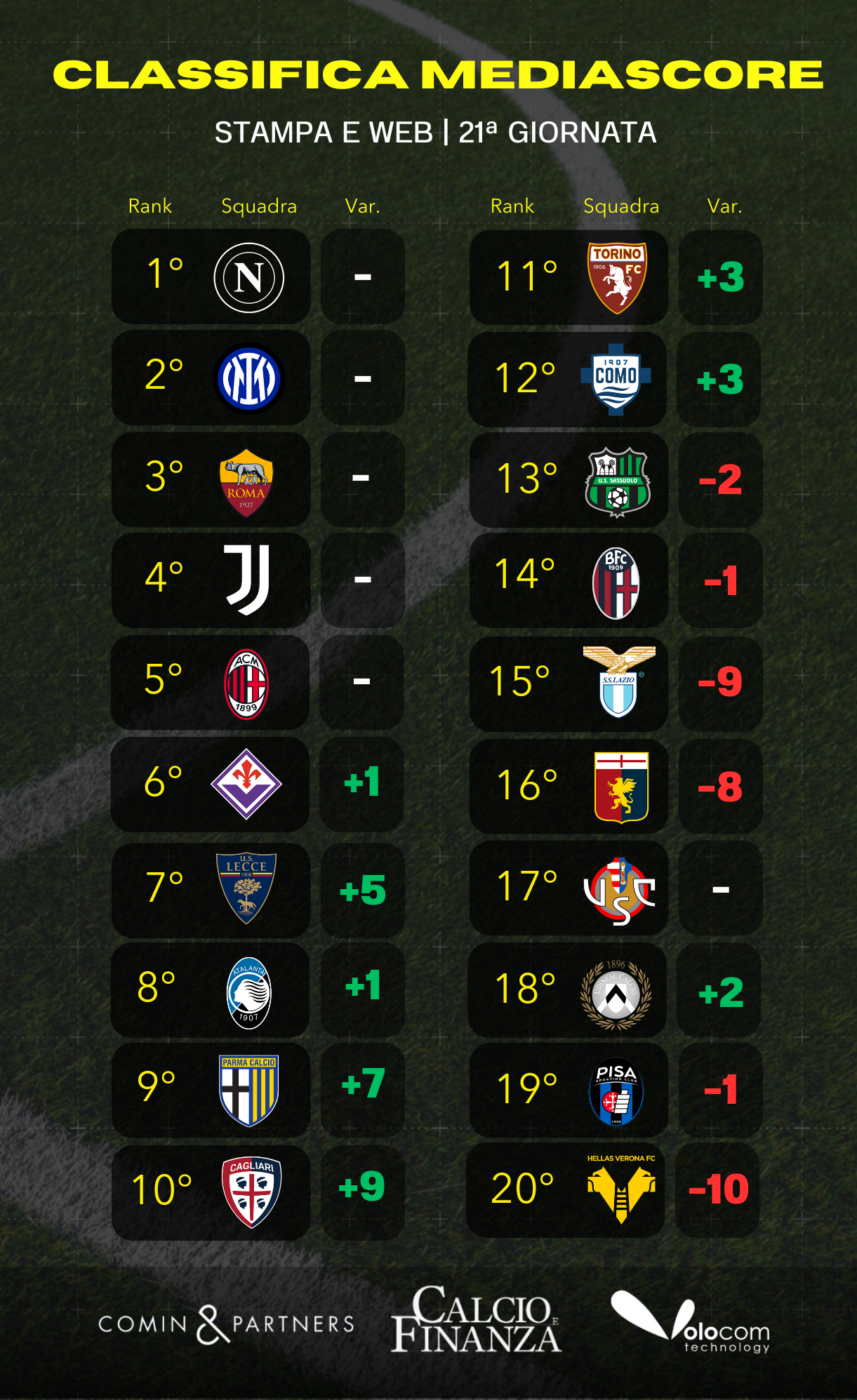 Questo il verdetto della classifica MediaScore, la rilevazione a cadenza settimanale di Comin & Partners e Volocom che traccia il volume delle conversazioni social e le menzioni su stampa e web che coinvolgono i venti club della massima divisione al termine della 21esima giornata di Serie A.