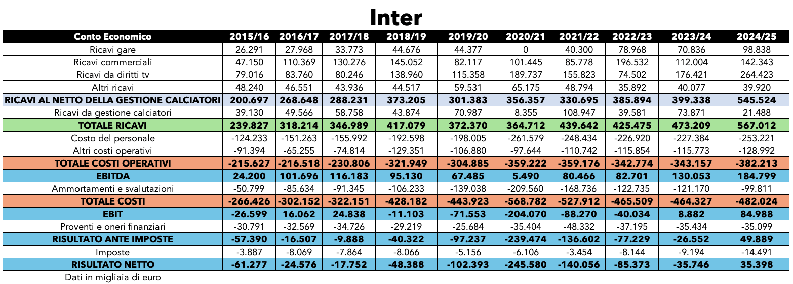 Nel caso dell’Inter, però, a questo va sommata una spinta ulteriore e straordinaria: la finale di Champions League, che ha amplificato sia i premi UEFA sia l’appeal globale del club nel corso dell’esercizio. Un elemento che contribuisce a spiegare il livello particolarmente elevato dei ricavi audiovisivi e la forte crescita dell’EBITDA rispetto alla media storica.