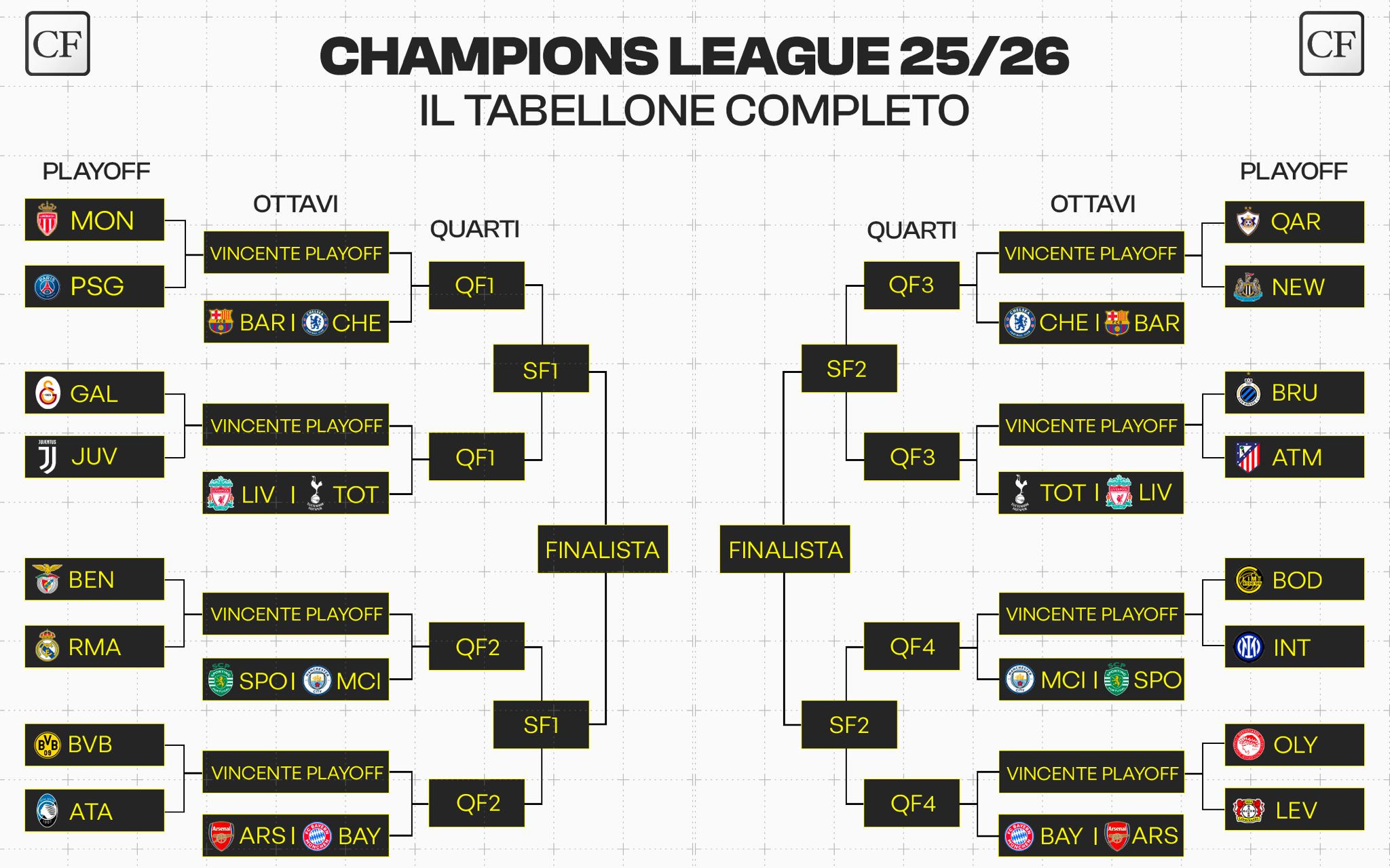 Si è tenuto questa mattina il sorteggio dei playoff della seconda edizione della nuova Champions League. Le otto squadre teste di serie (tra cui Inter, Juventus e Atalanta) sono state accoppiate alle otto non teste di serie per definire la prima parte del percorso che porterà fino alla finalissima del 30 maggio, in programma a Budapest.