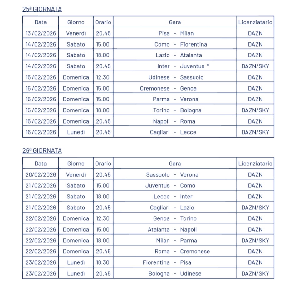 Ufficializzato il calendario dei playoff della UEFA Champions League, in programma a febbraio, anche la Serie A ha svelato gli orari di anticipi e posticipi fino alla 26esa giornata del campionato 2025/26. Dal derby di Italia fra Inter e Juventus agli impegni delle altre big, sono diverse le sfide ad alto fascino per cui sono stati svelati ufficialmente oggi gli orari da parte della Lega Calcio.