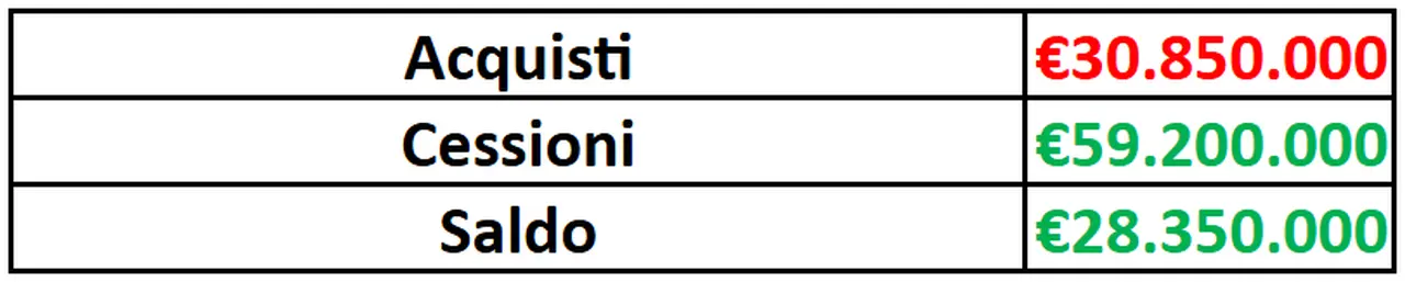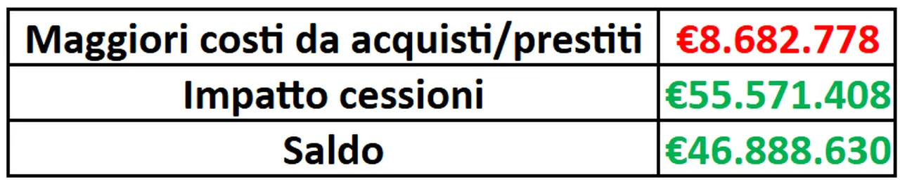 Tra entrate e uscite il saldo del mercato invernale per i nerazzurri è stato ampiamente positivo per oltre 32 milioni di euro. Considerando solamente i cartellini, invece, il saldo rimane comunque positivo, ma per 13 milioni di euro.