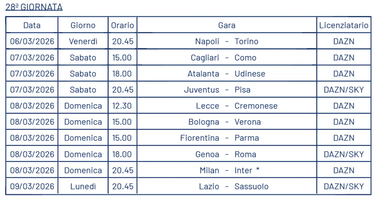 La Lega Serie A ha ufficializzato il calendario del campionato italiano dal 28° al 30° turno. Tra le sfide programmate nelle prossime settimane spicca il derby di Milano che, come anticipato da Calcio e Finanza nei giorni scorsi, si giocherà domenica 8 marzo, con calcio d’inizio fissato alle ore 20.45.
