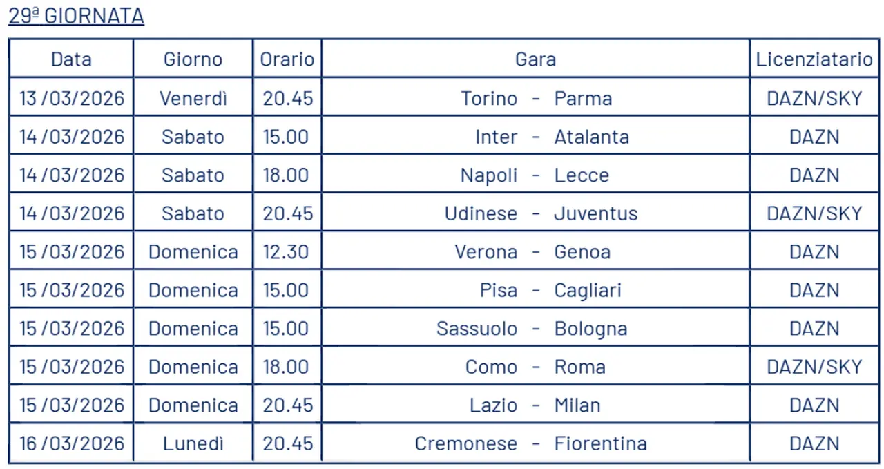 Tra gli incontri più interessanti spicca anche un Inter-Atalanta, in programma alle ore 15.00 di sabato 14 marzo e nello stesso turno il match tra Lazio e Milan, domenica sera allo stadio Olimpico di Roma. Altro match di rilievo domenica 22 marzo, quando in posticipo l’Inter sfiderà la Fiorentina, a caccia di punti per la salvezza.