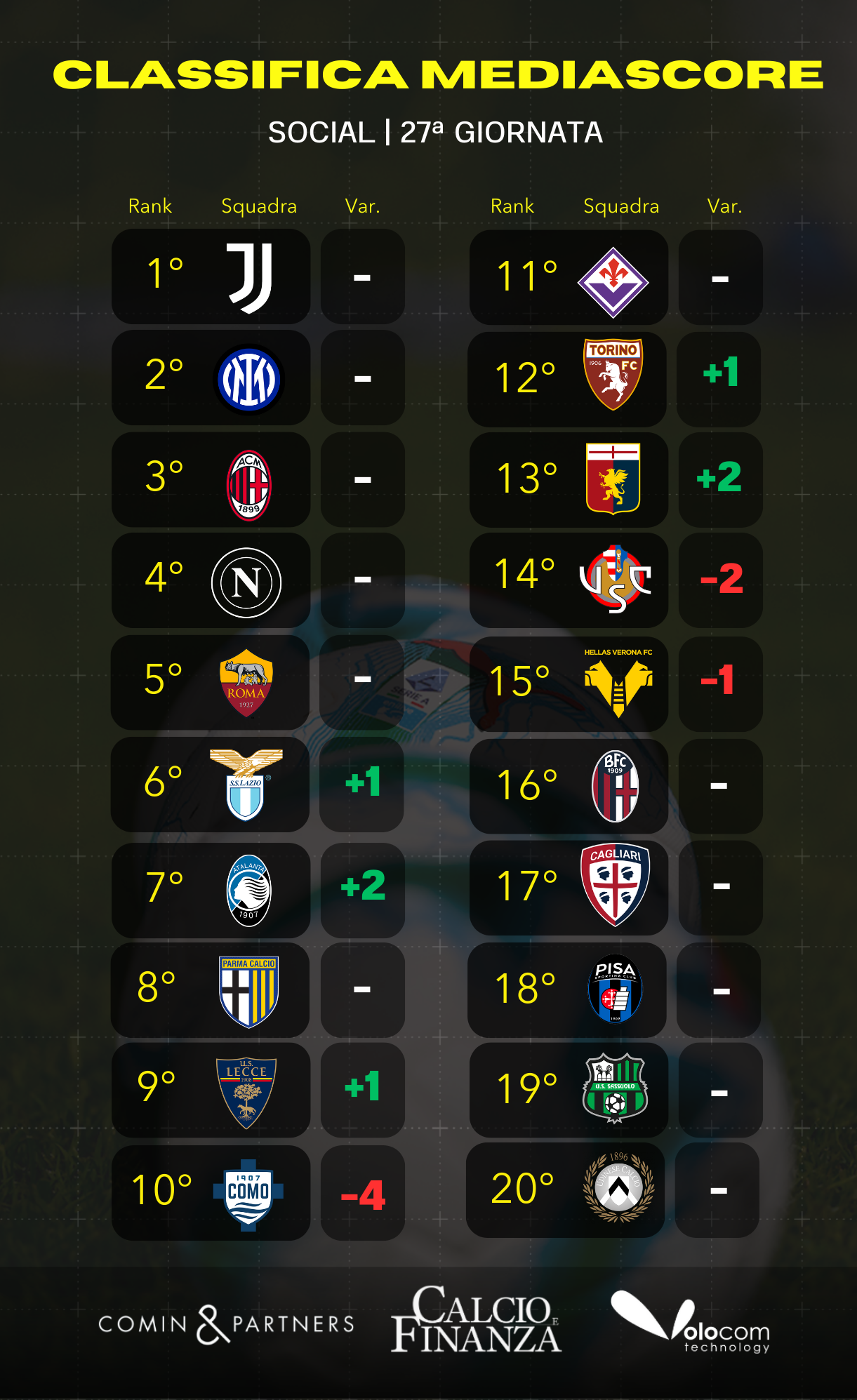 MediaScore giornata 27 – Come cambia la classifica sui social