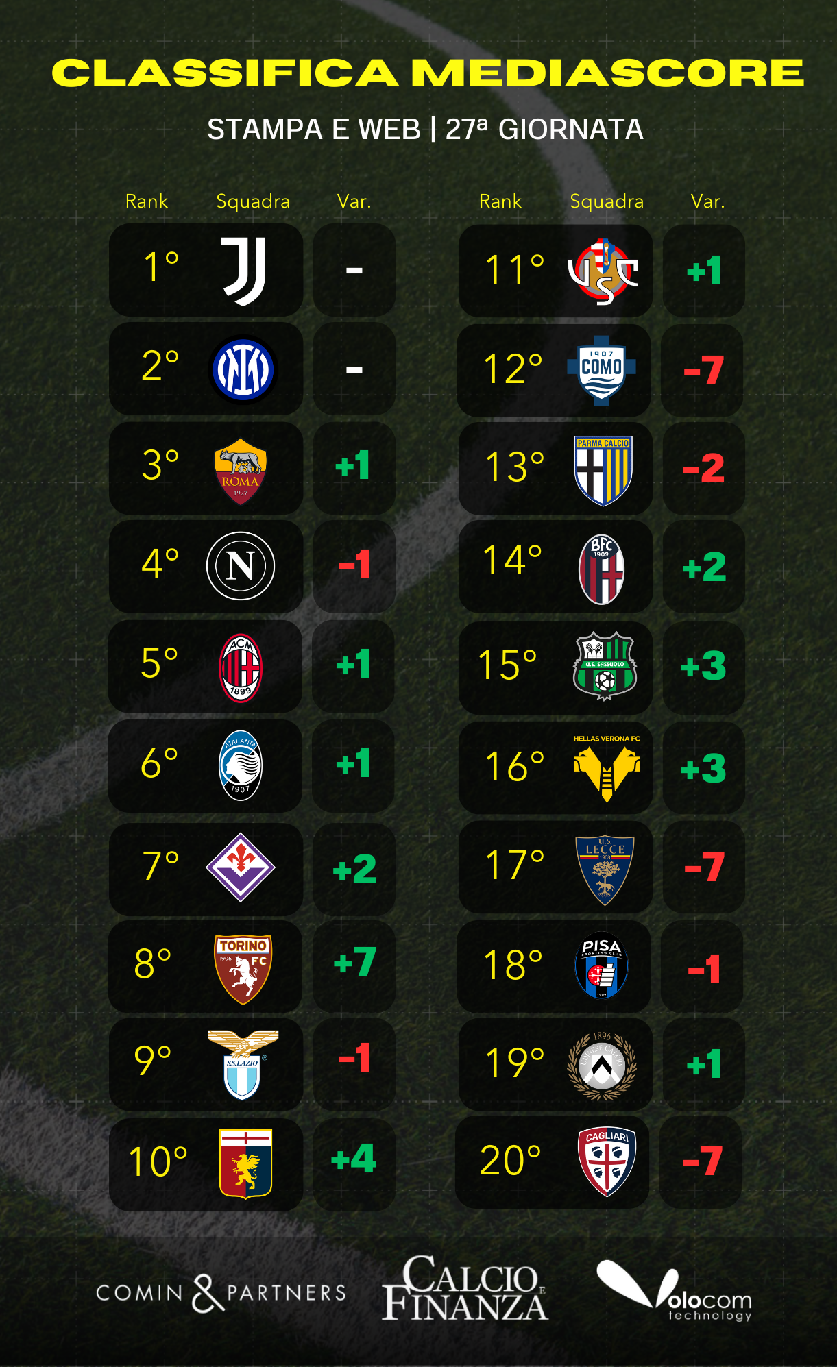 La classifica stampa e web rimane di dominio bianconero, con l’Inter a seguire. La capolista guarda dall’alto le avversarie, con 19.332 citazioni; i nerazzurri di Milano a 18.403 citazioni. La Roma sfrutta il rocambolesco tre pari con la Juve per guadagnare una posizione e piazzarsi terza in classifica, con 12.707 menzioni.
