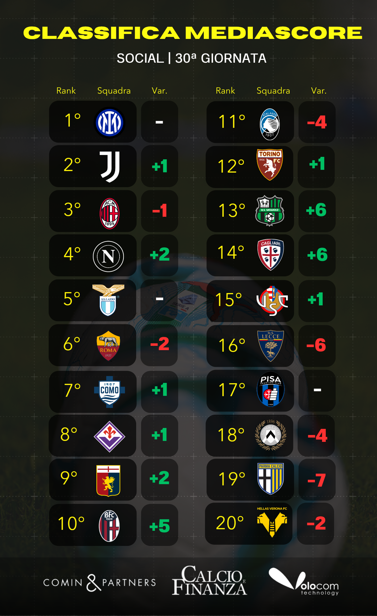 MediaScore giornata 30 – Come cambia la classifica sui social
