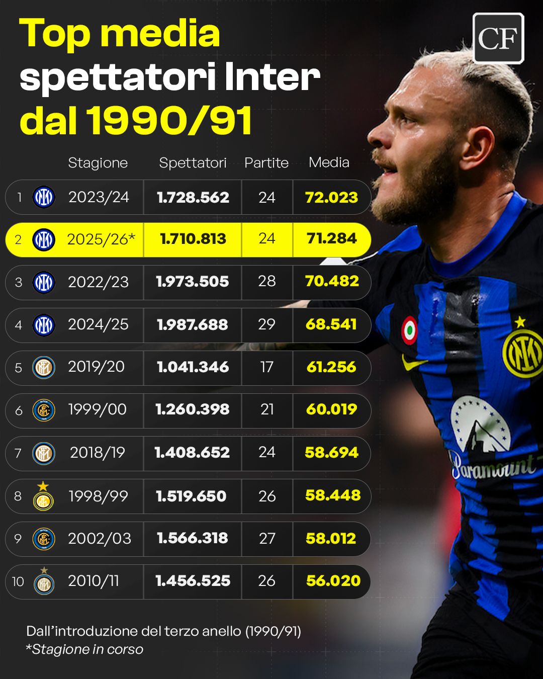 L’ultimo dato corposo di pubblico è arrivato dalla semifinale di ritorno di Coppa Italia contro il Como, terzultima gara interna stagionale: 73.255 spettatori presenti, di cui 3.230 nel settore ospiti, per un colpo d’occhio ancora una volta imponente. Una cornice che si inserisce in una stagione caratterizzata da numeri altissimi e continui sold out, con una media attuale superiore ai 71mila spettatori.
