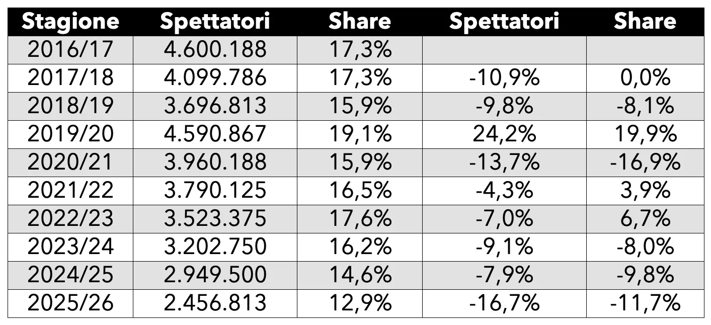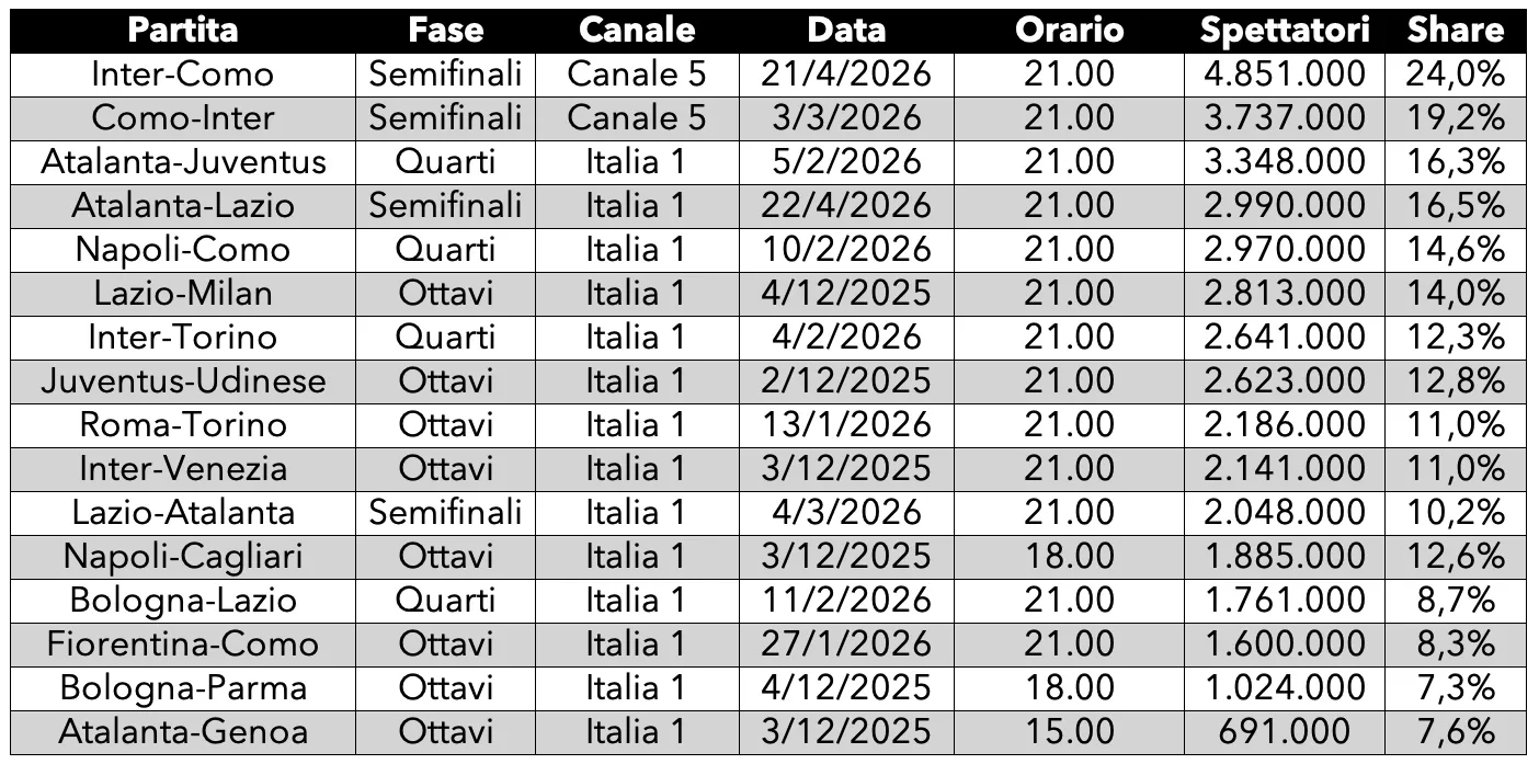 Proprio per questo nella stagione 2025/26 le partite dagli ottavi di finale fino alle semifinali hanno registrato una media spettatori inferiore ai 2,5 milioni con uno share medio del 12,9%. Si tratta dei dati più bassi presenti nella tabella sopra, che comprendono anche gli ascolti di quando era la Rai la detentrice dei diritti televisivi della Coppa Italia. Facendo un confronto con la stagione scorsa, Mediaset ha registrato una flessione di quasi il 17% per quanto riguarda gli spettatori medi dagli ottavi alle semifinali e un -12% per lo share medio.