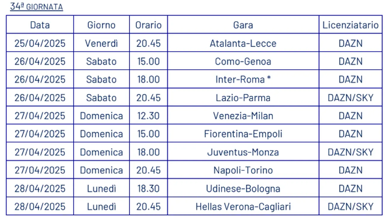 Tra i match più interessanti spicca Inter-Roma, programmata sabato 26 aprile alle ore 18.00 per consentire ai nerazzurri di preparare al meglio la trasferta di Champions a Barcellona. Nel turno successivo i nerazzurri scenderanno in campo sempre di sabato, alle ore 20.45 contro l’Hellas Verona. Tra le sfide di alto livello anche Fiorentina-Roma e Bologna-Juventus, in programma domenica 4 maggio, rispettivamente alle 18.00 e alle 20.45.