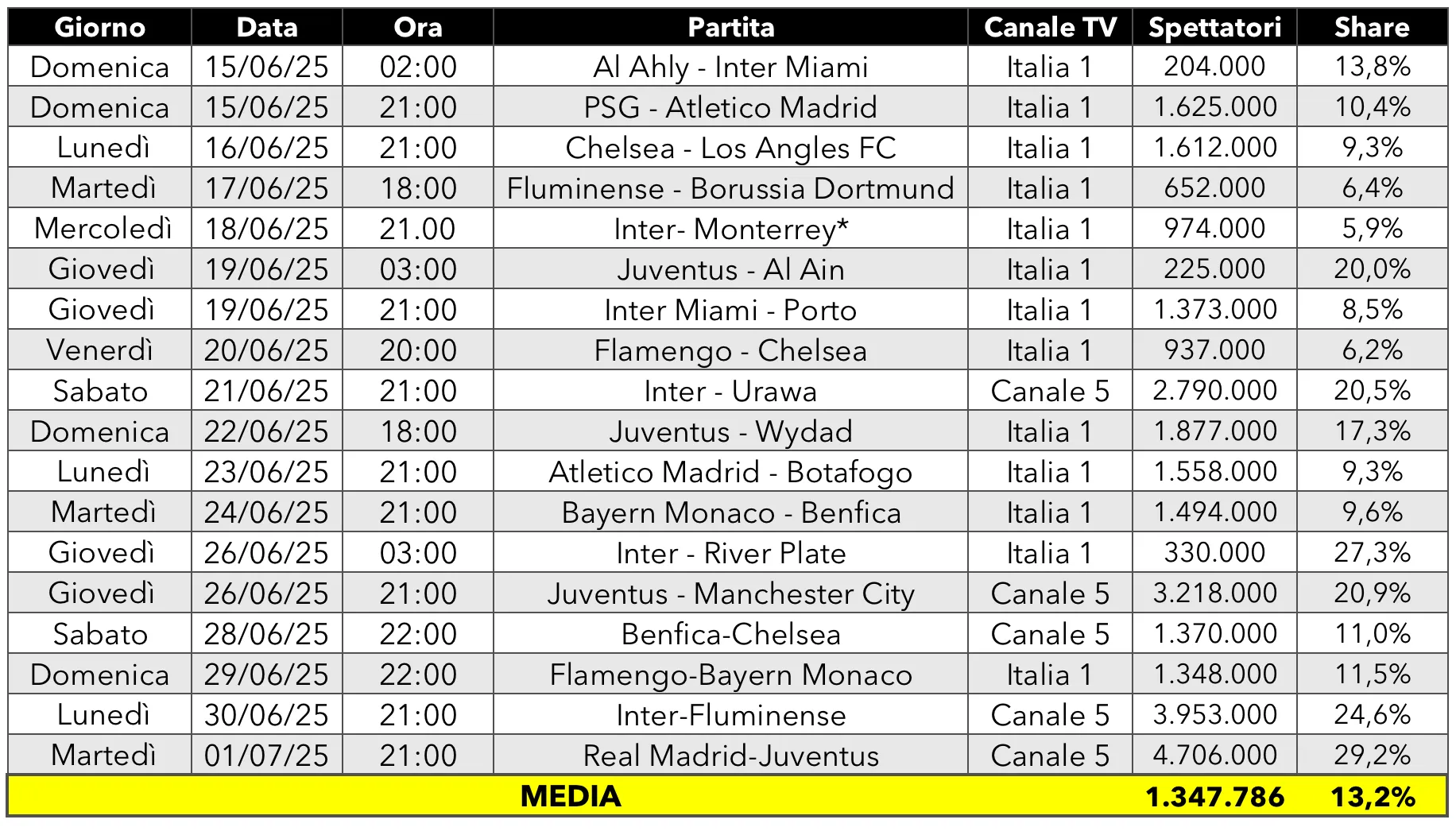 Come si vede dalla tabella, delle 18 partite fin qui trasmessa da Mediaset, Real Madrid-Juventus è stata fin qui la più seguita, sia come numero di spettatori che di share, andando a superare quella mandata in onda lunedì sera fra Inter e Fluminense, altro ottavo di finale, che si è fermata a quasi 4 milioni di spettatori per uno share del 24,6%.